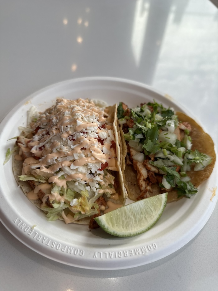Street Taco — One street taco made with grilled chicken and an onion-cilantro mix, served on a corn tortilla, and one gringo taco made with grilled chicken, topped with lettuce, tomato, queso fresco, and Locoz Tacoz’s signature sauce, served on a flour tortilla.