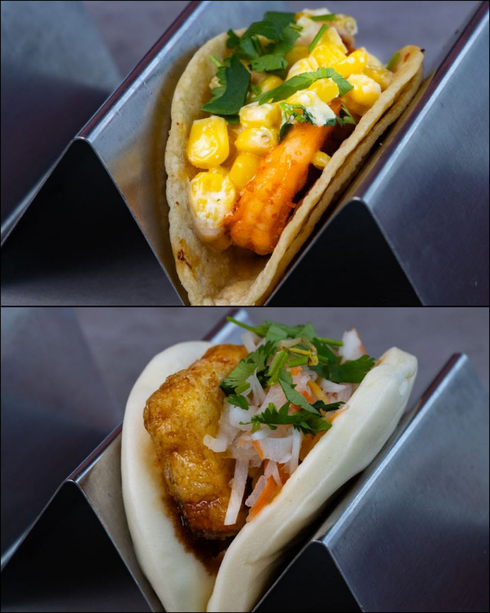 Tofu Baco Combo — Two tofu bacos with your choice of soy ginger sauce or panang curry sauce, topped with Asian slaw.